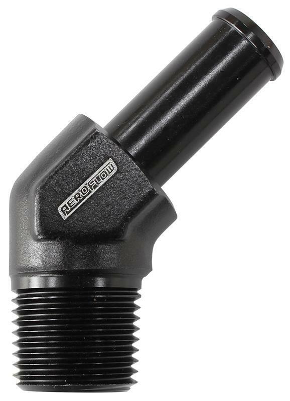 45° Male NPT to Barb. Easily adapt from NPT thread to a simple barb on a 45 degree angle. Barb sizing is to suit 400 & 500 series push on hose. Available in various sizes with Blue, Black and Silver finishes.