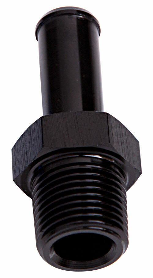 Straight Male 3/8" NPT to 3/8" (9.52mm) Barb. These handy NPT to straight hose barb fittings are designed to allow easy fuel line installation on electric fuel pumps and regulators when using rubber fuel line. They have a male NPT fitting on one end and a barbed fitting on the other end and they're available in different sizes to fit your needs.These barb sizes are designed to work with Aeroflow 400 series and 500 series Push Lock Rubber hose. Available in various sizes with Blue, Black and Silver finishes. We recommend a hose clamp be used to secure the hose to the barb.