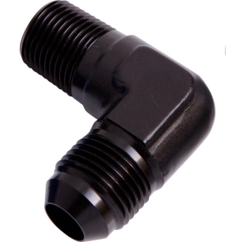 90° NPT To AN Forged Adapter. Male NPT to Male AN adapter. Adapt from an NPT thread to AN flare with a 90 degree bend. Various sizes available. Available in Blue, Black and Silver.